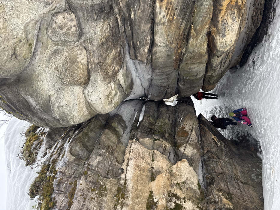 The image depicts a narrow, snow-covered passage between large, stratified rock formations in Shumikhinskii, Russia. The passage floor is entirely covered in white snow, indicating a winter environment. The rock walls, composed of weathered grey, brown, and tan stone, rise steeply on both sides, creating a natural archway or constricted gully. Some sections of the upper rock faces and snow banks show patches of green moss and sparse, dormant vegetation. Four individuals are present within the snowy passage, positioned from foreground to midground. In the immediate foreground, a child wearing a blue jacket and pink pants is seated or kneeling on a pink sled-like object, facing slightly right and down the snowy slope. Behind this child and to the left, a second person, dressed in a dark jacket, is bending forward. Further into the passage, a third individual wearing a red jacket and dark pants is standing or walking on the snow-covered path, facing away from the viewer. A fourth person, partially obscured behind the third individual, is also present deeper within the passage. The overall scene suggests recreational traversal or exploration of the natural rock formation during snowy conditions.