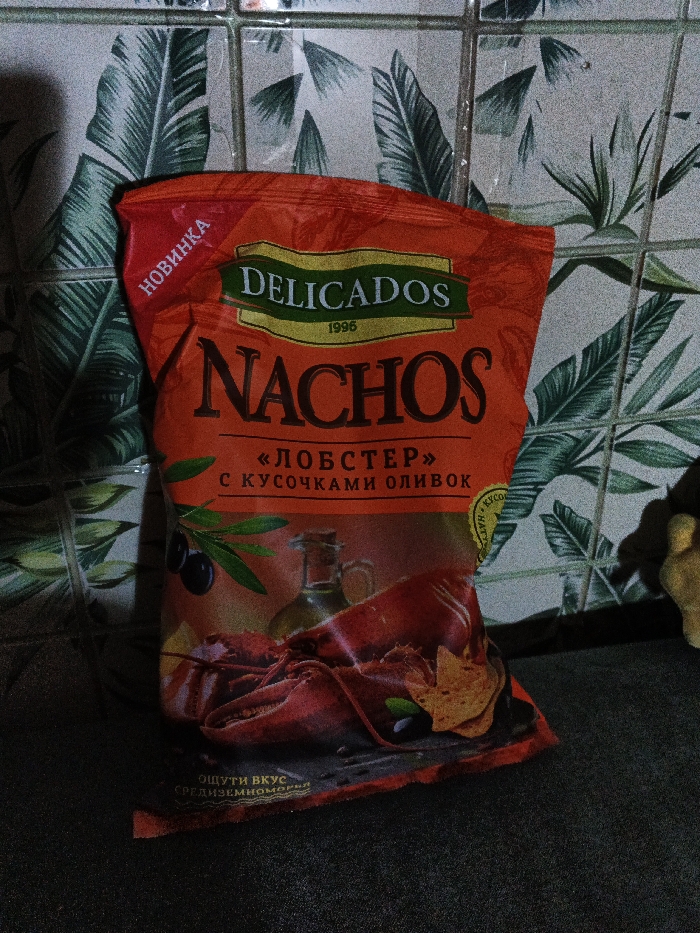 A vertical photograph captures a Delicados Nachos bag, orange in color, resting on a dark, textured surface against a tiled wall in a domestic setting within Chaikovsky, Russia. The bag's front prominently displays "DELICADOS 1996" and "NACHOS" branding. Below, the text "«ЛОБСТЕР» С КУСОЧКАМИ ОЛИВОК" indicates a lobster with olive pieces flavor. A red banner in the upper left corner of the bag reads "НОВИНКА" (NEW). The packaging illustration depicts a cooked red lobster, an olive branch with black olives, tortilla chips, and a small bottle of olive oil, accompanied by the text "ОЩУТИ ВКУС СРЕДИЗЕМНОМОРЬЯ" (TASTE THE MEDITERRANEAN). The background wall is composed of light-colored square tiles featuring a repeating pattern of green tropical leaves. A distinct shadow falls on the upper left portion of the tiled wall. A small, irregularly shaped, light-colored object is partially visible on the dark surface to the right of the bag. No individuals are present, and no actions or interactions are occurring.