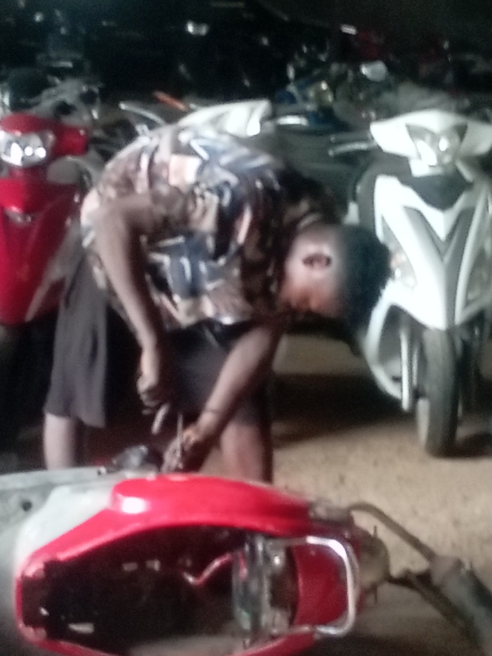 An adult male is depicted performing maintenance on a red scooter within an indoor workshop or sales environment located in Nnobi, Nigeria