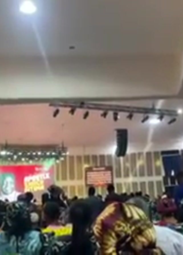 interior of a large, crowded auditorium or church. In the background is a stage with a large screen displaying an image of a man named "Apostle Enoch Sitima" and text referencing a Bible verse (Esther 3:9). The lighting is bright, with multiple spotlights hanging from the ceiling. There are large speakers on either side of the stage. The audience is diverse, with many people wearing head coverings. People are moving around and talking. A man in a suit walks in front of the camera briefly.