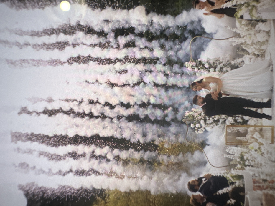 An outdoor wedding ceremony is captured in Colombes, France, featuring a couple centrally positioned amidst pyrotechnic effects and floral decorations. In the foreground-center, a young adult male, with dark hair and a beard, wearing a dark suit, stands facing a young adult female, with dark hair and a white strapless wedding gown and veil. They are holding hands, with the male appearing to place or adjust something on the female's finger, likely a ring. To their left, a golden decorative structure, possibly cage-like, stands on the ground, surrounded by white floral arrangements. Behind and around the couple, white and pink floral decorations are arranged on golden archways. A significant volume of white smoke or fog emanates from the ground level around the couple and decorations. In the background, numerous vertical plumes of sparkling light-colored particles and smoke rise high, creating a dense, sparkling wall effect, consistent with cold fireworks or confetti cannons. These plumes are set against a backdrop of dark green trees or foliage, indicating an outdoor, possibly garden, venue. A bright, circular light source is visible in the upper right portion of the sky. To the far left of the frame, a male with a beard, wearing a dark suit, holds a microphone and appears to be speaking or officiating. Other indistinct figures are partially visible next to him. To the far right, a female with dark hair, wearing a dark top, is visible clapping her hands. The overall scene depicts a celebratory moment during a wedding ceremony with dramatic special effects.
