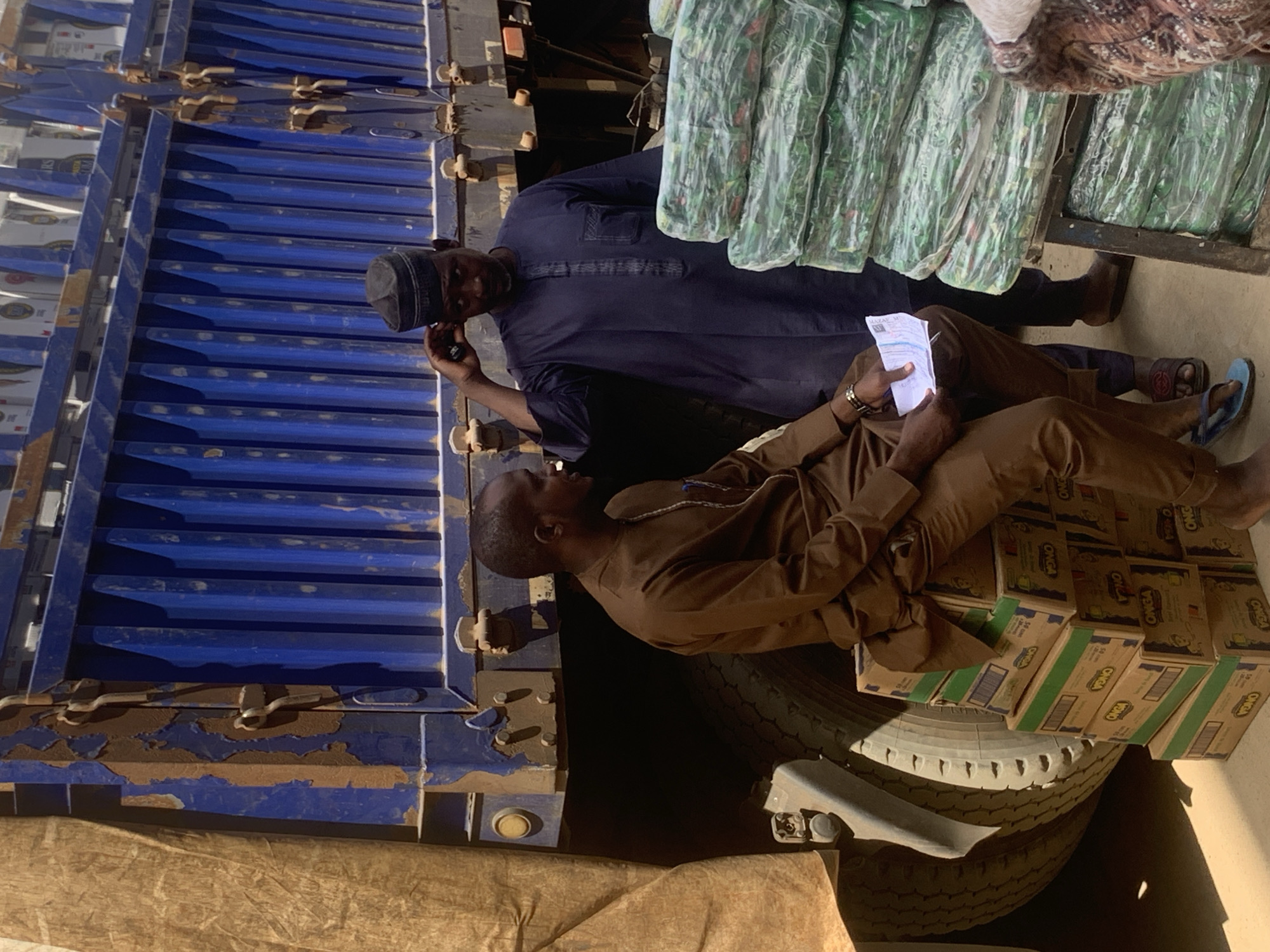 The scene is set outdoors in Fagge C, Nigeria, on a bright day. Two men are positioned near a large, weathered blue truck. The truck's blue paint is extensively peeled and rusted, revealing a reddish-brown undercoat, particularly on its side panels. The truck bed is visibly loaded with numerous white boxes, some marked with "HASTA" and "GOLDEN STARS." A man is seated on a stack of approximately eight brown cardboard boxes, each branded with "ONGA" and green accents. He wears a brown tunic and trousers, with one foot bare and the other wearing a light blue flip-flop. A wristwatch is visible on his left wrist. He holds several white papers with blue markings in his hands, seemingly engaging in a discussion. Standing opposite him is a second man, dressed in a dark blue tunic and a dark blue cap. He holds a dark object, possibly a phone or earpiece, to his right ear. His gaze is directed towards the seated man. He wears brown sandals. To the right, a tall stack of merchandise wrapped in clear plastic, revealing green contents, rests on a metal frame. To the far left, a large section of light brown, canvas-like material is visible, partially obscuring the background next to the truck's rear tire. The ground is a light, dusty surface. Shadows are distinct, indicating direct sunlight. The interaction between the two men appears to be a commercial exchange or discussion related to the goods.