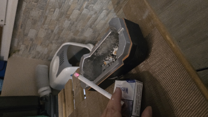 The scene is set in an interior or balcony area in Pleven, Bulgaria. A human hand, partially visible, holds a lit white cigarette with a glowing pink tip, positioned over a rectangular ashtray. The ashtray is dark gray and black, containing multiple extinguished cigarette butts and loose ash. Adjacent to the ashtray rests a blue and white pack of "Winston" cigarettes, displaying Bulgarian text, including a health warning. These items are situated on a light brown wooden surface, partially covered by a brown woven mat. In the background, a wall is clad with light-colored, horizontally stacked stone or tile. To the left of the wall, a white and gray appliance-like object, possibly a covered pet litter box, is visible, with a light gray cylindrical item resting on its top surface.