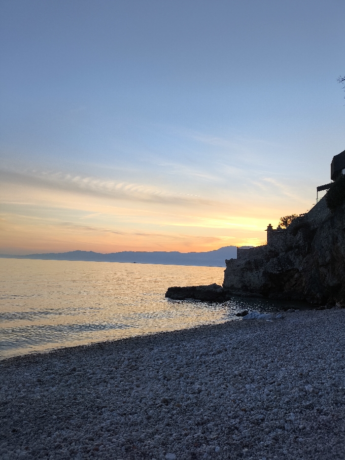 A wide-angle landscape photograph captures a sunset over the Adriatic Sea from a pebble beach in Grad Rijeka, Croatia, specifically along the Kantrida-Bivio coastline
