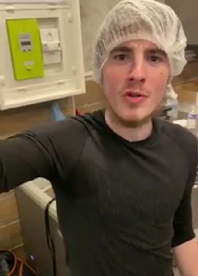 Here's a detailed description of the video: A young man with a light beard and wearing a white hairnet and black gloves stands in what appears to be a kitchen or food preparation area