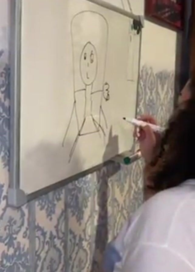 person standing in front of a whiteboard, drawing a figure with a marker. The person is wearing a white shirt and has curly hair. The whiteboard is mounted on a wall with a patterned wallpaper. There is also a picture frame hanging on the wall next to the whiteboard. The figure drawn on the whiteboard has a large head, a simple face, and a body with arms and legs. The figure is also holding something in one hand. The person is focused on drawing and does not interact with anyone else in the video.