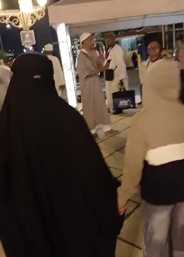 Here's a detailed description of the video: The video shows a crowded outdoor scene at night. Several people are walking along a paved walkway. Some are dressed in traditional Islamic clothing, including a woman in a full black burqa and men in white thobes and head coverings. Other people are wearing casual clothing like t-shirts, jackets, and jeans. There is a child wearing a hoodie and jeans walking in the foreground. In the background, there are white tents or canopies lit from within, suggesting some kind of event or gathering. Some people are standing around tables under the tents. Decorative streetlights illuminate the area. The architecture of a tall building can be seen in the background. The atmosphere appears busy and social.