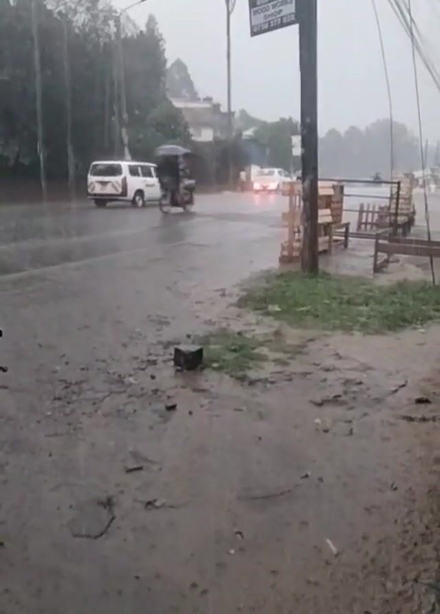 street during a heavy rain. A white van and a small motorbike with a black umbrella are driving on the road. The road is wet and there are puddles. On the side of the road, there's a sign that reads "WOOD WORKS SHOP," and some wooden benches. The ground is muddy. The video appears to be taken from a stationary position. The weather is overcast.