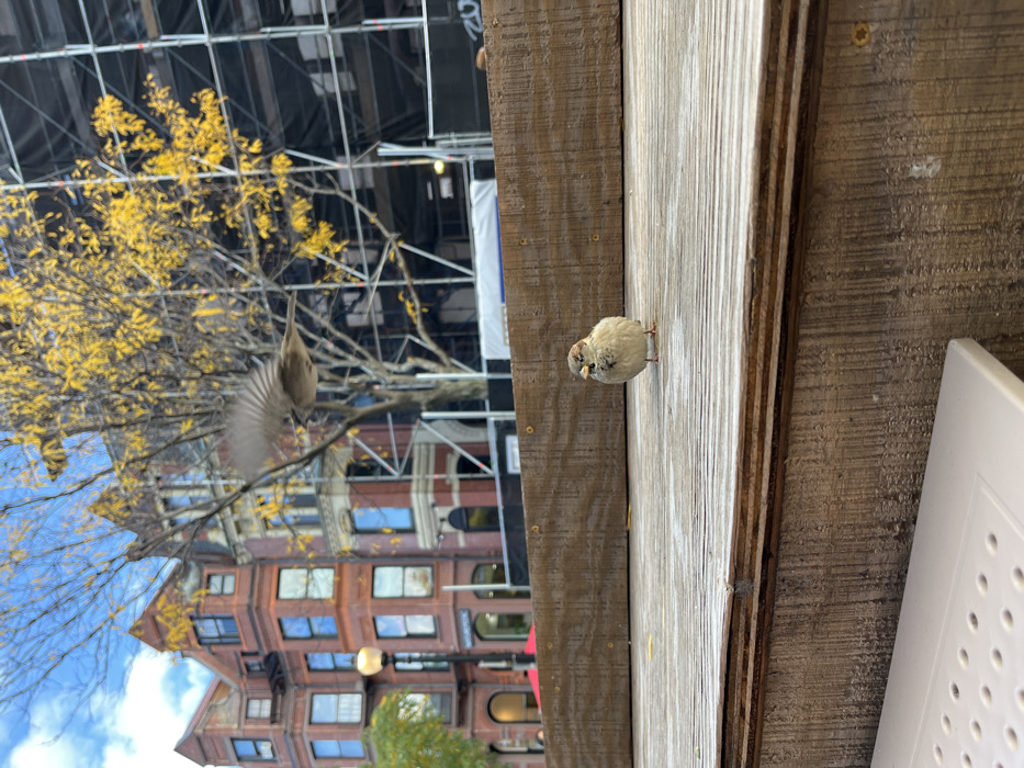 This image depicts an urban autumn scene in Boston, United States. In the foreground, a house sparrow stands on a light brown wooden deck, facing slightly left with a small, light-colored object in its beak. Another house sparrow is captured in blurred mid-flight above and behind the first bird, wings spread, moving towards the left. The background features a street lined with multiple multi-story red brick buildings, characteristic of Boston's Back Bay or South End neighborhoods, exhibiting bay windows and traditional architecture. A black street lamp with an ornate top is visible on the left. A deciduous tree with vibrant yellow autumn foliage stands between the buildings and the scaffolding. To the right, a large building is undergoing renovation or construction, extensively covered by metal scaffolding and black netting. The sky overhead is clear blue with some scattered white clouds. A corner of a white, perforated plastic outdoor table is partially visible in the lower-left foreground. No human figures are present.