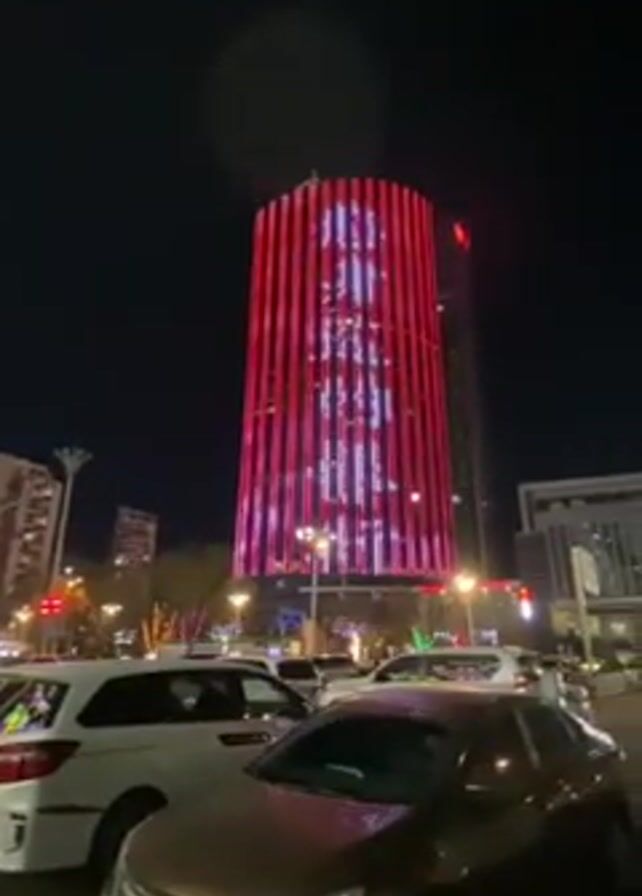 tall, cylindrical building at night, illuminated with red and pink vertical stripes. The building displays moving white images. The surrounding area appears to be a parking lot with several cars. Streetlights are visible, and other buildings are in the background. The sky is dark.