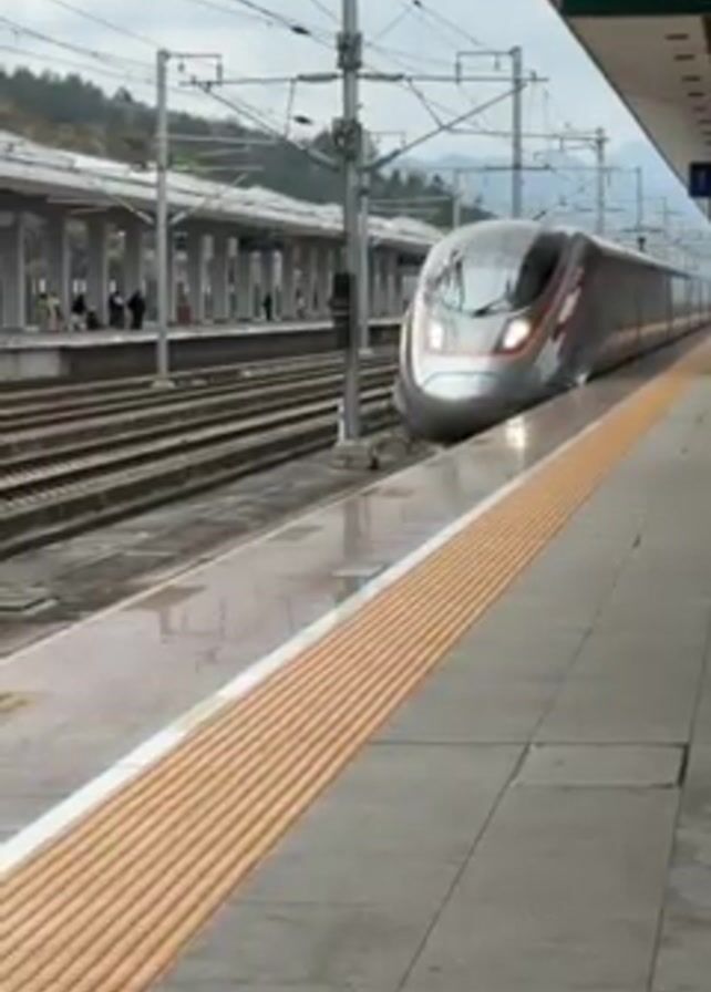 A silver and red bullet train pulls into a station on a cloudy day. The train is sleek and modern, and it is moving slowly as it approaches the platform. The platform is gray, and there is a yellow safety strip along the edge. There are a few people waiting on the other platform. The station is surrounded by trees and hills.
