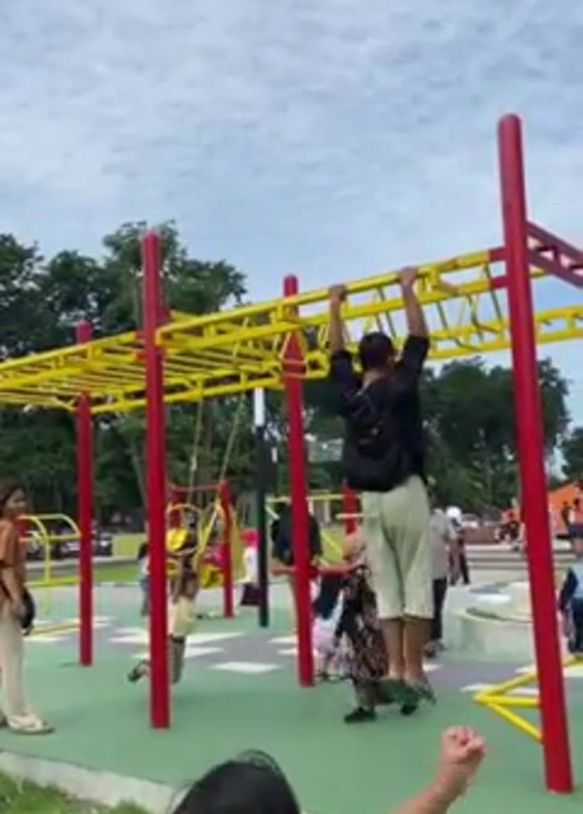 n outdoor playground scene on a partly cloudy day. A young man in a black shirt, light-colored pants, and flip-flops hangs from and moves across a yellow and red monkey bar set. There are several adults and children in the background. Some children are on swings, and others are walking or standing nearby. A young girl in a white shirt with a graphic on it appears in the foreground, looking toward the camera and possibly speaking. The ground is a mix of green grass and colorful artificial turf in the playground area. Trees are visible in the background, along with some buildings in the distance.