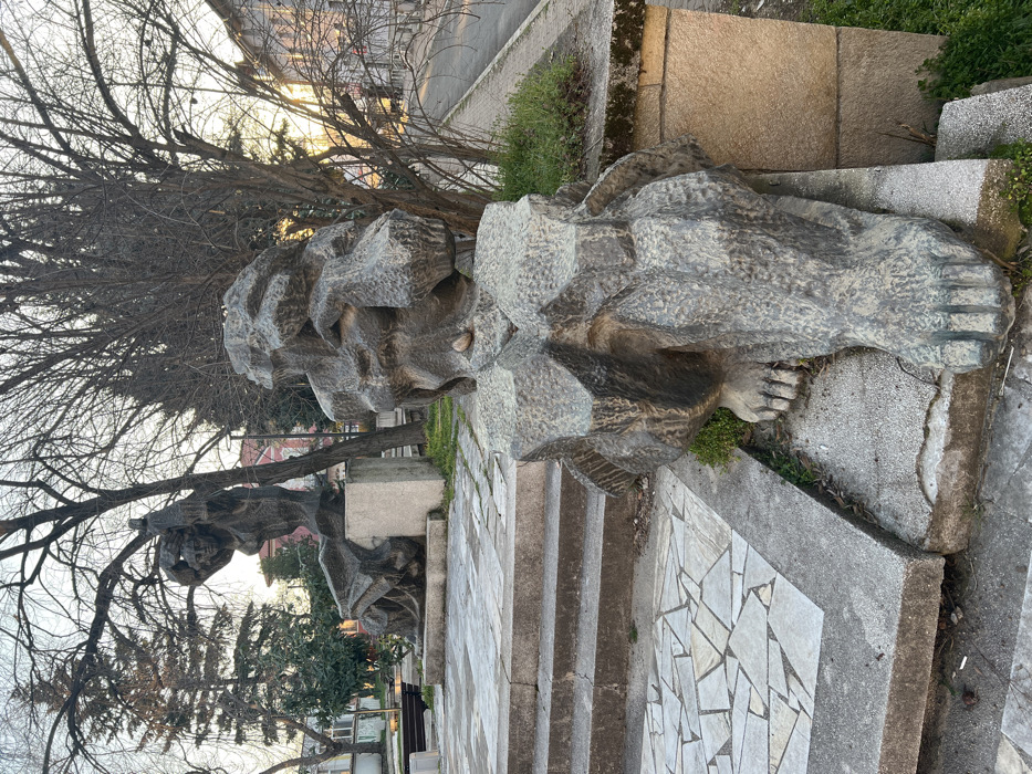 This image depicts a public space in Kardzhali, Bulgaria, featuring two large, stylized sculptures. In the foreground on the right, a dark, angular, abstract sculpture, possibly representing a seated or crouching figure, is positioned on a concrete base. A small, light-colored pebble rests on an upper surface of this sculpture, which also displays large, blocky feet at its base. To the left and slightly behind, a second dark, stylized sculpture depicts a seated or kneeling female figure with visible facial features and what appears to be an object or arm raised above her head. This sculpture also rests on a concrete pedestal. The ground area in front of the sculptures consists of a light-colored mosaic pavement made of irregularly shaped stone or concrete tiles, leading to a set of three grey concrete steps. Green vegetation, including small bushes and ground cover, is visible around the bases of the sculptures and along the edges of the paved areas. Bare-branched deciduous trees dominate the background, with some smaller evergreen trees also present. Behind the trees on the right, a paved street or sidewalk runs alongside buildings with visible windows. The sky is bright, with a soft, warm light visible through the tree branches on the right, suggesting late afternoon.