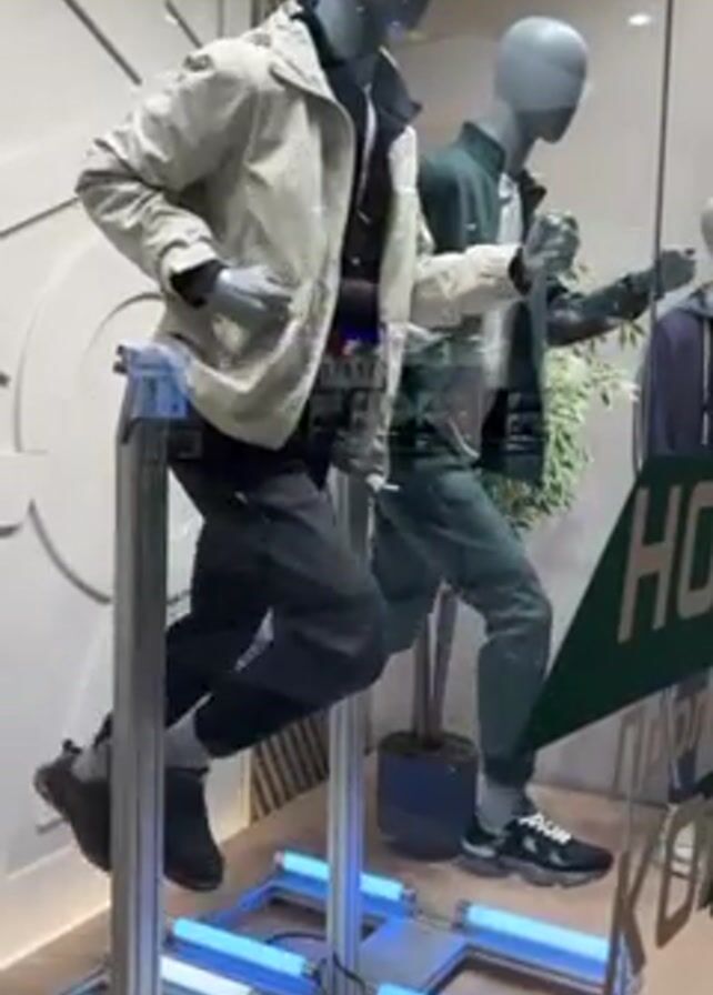 The video depicts a store window display featuring several mannequins. The primary mannequin, positioned at the front, is dressed in a light-colored jacket, a dark shirt, and dark pants, with matching sneakers. It is set on a small, blue-lit platform that simulates a running motion, with the mannequin appearing to jog in place. Behind the primary mannequin are additional mannequins, also dressed in athletic or casual attire. There are green display signs in the background with letters on them. The window has reflections of the surroundings, including what appears to be a building across the street. The scene is brightly lit.
