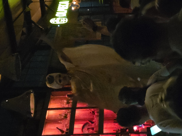 A dimly lit indoor scene features a skeleton figure in the center. It is illuminated by overhead lighting, with the bar's red illuminated backdrop adding color contrast. Several indistinct figures are present in the background. A green neon sign is visible above the skeleton. Additionally, a few light fixtures are seen on the left. The scene suggests a dimly lit bar or pub setting.