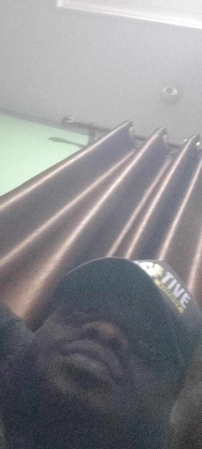 close-up of a brown fabric curtain. The curtain is folded in a series of pleats. The image is taken from a low angle, looking up at the curtain. There is a black object partially visible in the bottom right corner of the image. The object is a hat, with a yellow logo that reads "ACTIVE." The image was taken indoors, with the light source appearing to be from a window. The exact location of the image is unclear but is based on the coordinates provided.