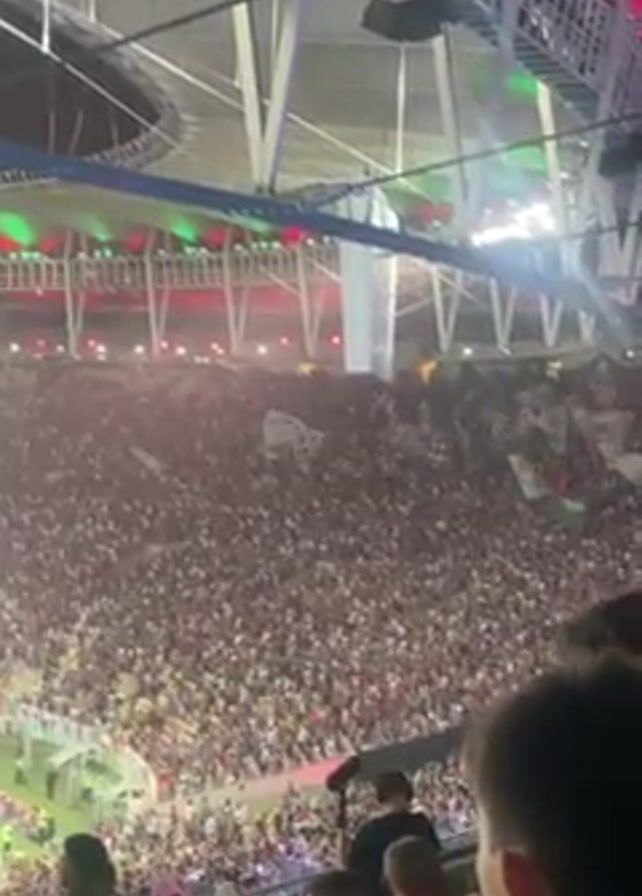 crowded stadium with many people cheering. A person filming the scene stands in a higher section of the stands. Hungarian flags are visible among the crowd. Above the stands, red and green lights illuminate the stadium structure. The environment appears loud and energetic, suggesting a live sports event.