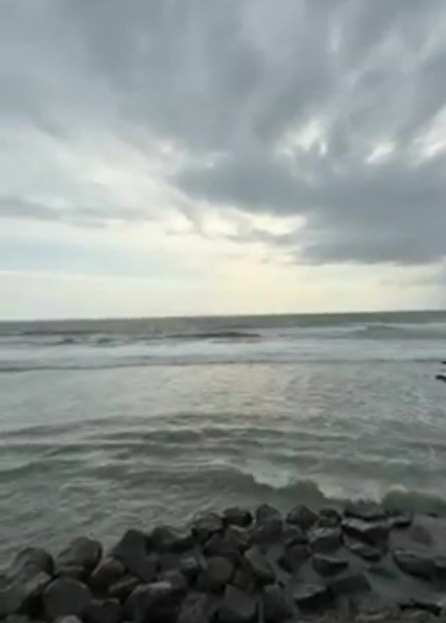 n ocean scene on a cloudy day. Waves are coming into shore. In the foreground, there are rocks that line the beach. In the distance, a person can be seen standing in the water.