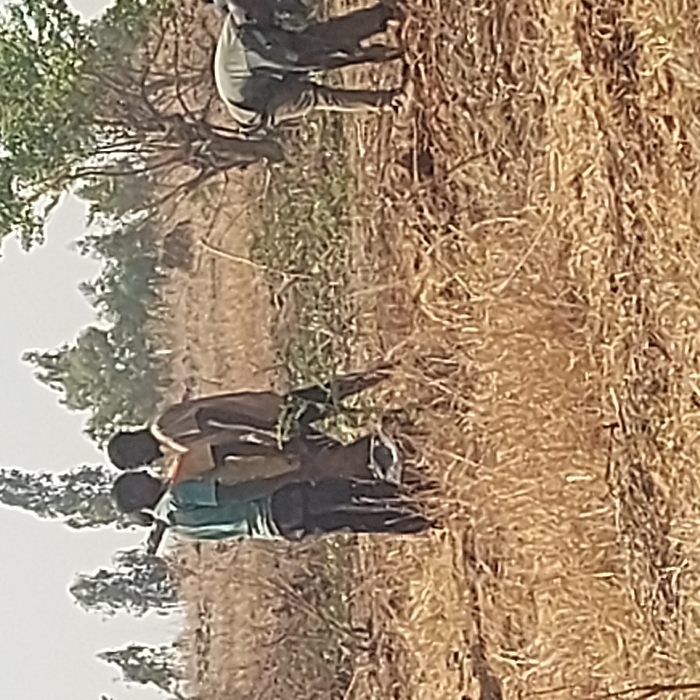 An outdoor scene shows people working in a field with dry grass and scattered greenery