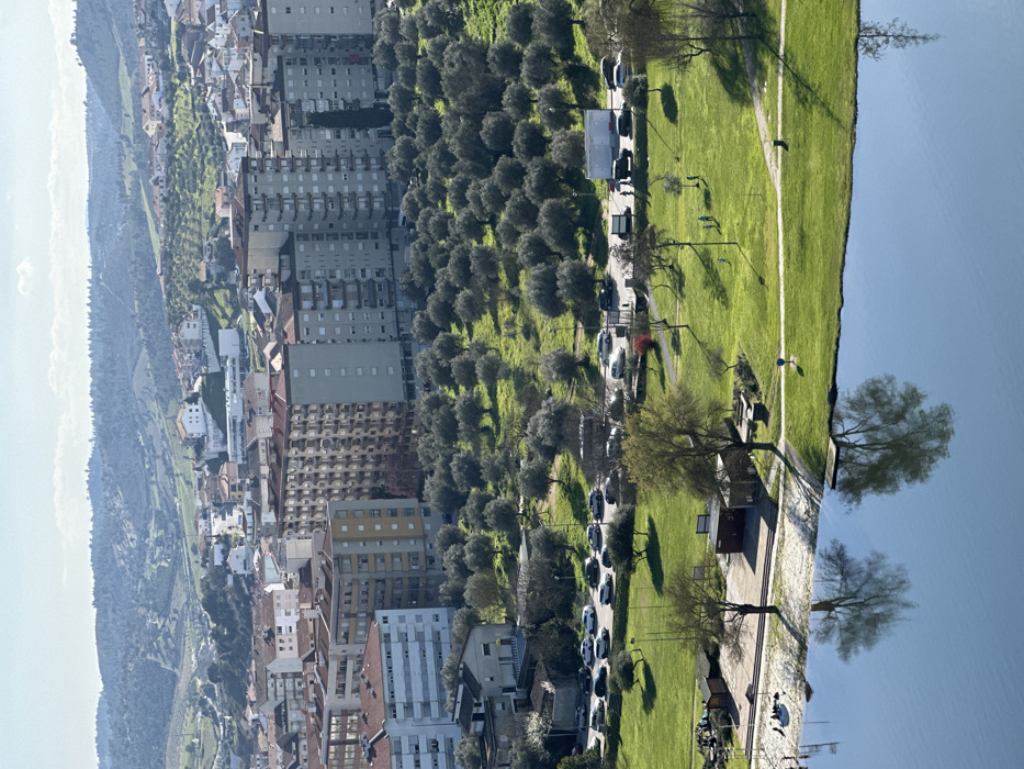 This elevated, wide-angle image depicts a segment of Mirandela, Portugal, under clear daylight conditions. In the foreground, a calm body of water, likely the Tâmega River, occupies the lower third of the frame, reflecting trees and the sky. Its left bank features a grassy area with two small, dark-roofed structures situated near the water's edge. Adjacent to these structures is a light-colored, possibly sandy or paved, stretch where approximately four indistinct figures are seated or lounging. Several deciduous trees with sparse foliage line the bank, casting long shadows across the grass and water. Further to the right in the foreground park area, a blue and white marker or buoy is visible near the water, along with a small, dark rectangular platform extending into the river. The midground transitions into an expansive, bright green park area dotted with numerous trees. Some trees exhibit full green foliage, while others appear to be deciduous with bare or sparse branches. Several small groups of individuals, totaling approximately 6-8 indistinct figures, are dispersed across the park's lawn, appearing to walk or stand. A paved two-lane road runs horizontally through the midground, separating the park from an olive grove. Numerous vehicles, predominantly cars of various colors (white, silver, dark), are visible on the road, some appearing parked and others potentially in motion. A white truck or large commercial vehicle is observed on the right side of this road. Beyond the road and the park, an extensive olive grove covers a gently sloping hillside, characterized by numerous, closely spaced olive trees with dense, dark green foliage. The background is dominated by the urban landscape of Mirandela. A dense concentration of multi-story residential buildings, primarily apartments with varying architectural styles, colors (e.g., beige, grey, white), and roof types (red tiles, flat grey), forms a prominent part of the city. Many of these buildings feature balconies. Further in the distance, more residential structures are visible extending up the surrounding hillsides, which are covered with sparse vegetation and appear hazy. The sky above is light blue with minimal cloud cover. The sun illuminates the scene from the left, indicated by the long shadows cast towards the right by trees and structures.