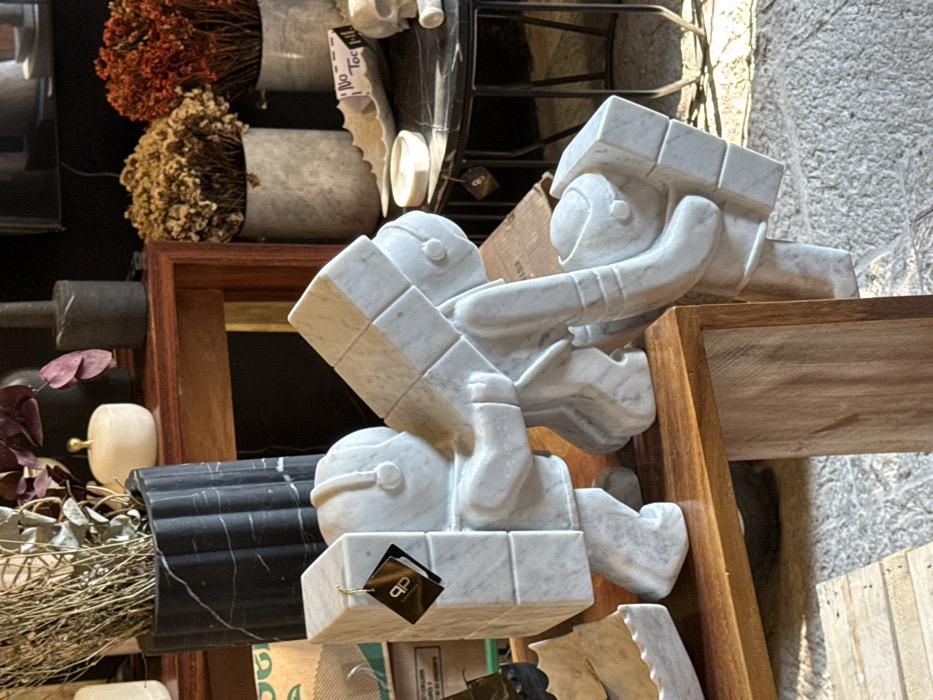 Two marble sculptures of stylized figures sit askew on a wooden frame. The figures seem to be supporting a block above them. Floral arrangements in marble pots are visible in the background, along with other decorative items. The sculptures are detailed with rounded helmets and simplified limbs, resembling blocky astronauts or workers. A black and gold tag is attached to the lower sculpture. The scene appears to be a display in a store or studio.