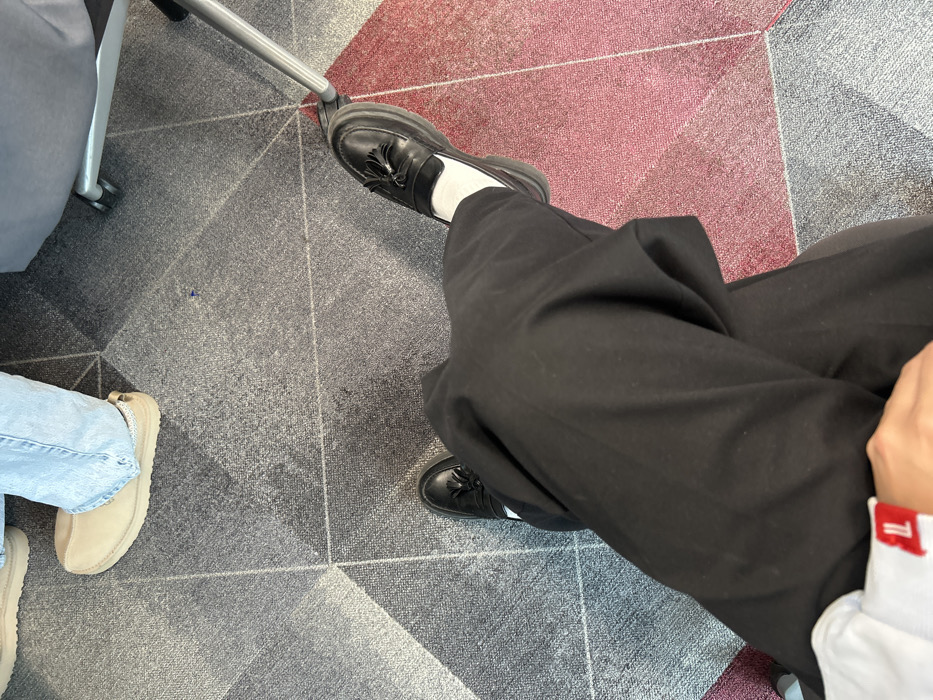 The image presents a top-down view of the lower bodies of two individuals seated indoors on a patterned carpet. The primary subject, in the foreground, wears black trousers, white socks, and black chunky-soled loafer-style shoes adorned with tassels. Their legs are crossed, and a white shirt cuff with a red rectangular tag is visible on the lower left. A second individual is partially visible in the upper left, wearing light blue jeans and tan slip-on shoes. The floor is covered by a carpet featuring a geometric design with sections of dark gray, lighter gray, and a prominent red triangular area on the right. A silver metal leg, consistent with a chair or table, is visible on the right side, positioned on the red carpet section. The specific location within Garston, United Kingdom, cannot be determined from the provided visual information.
