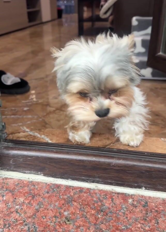 A small, fluffy dog with a light gray and brown coat stands on a brown marble floor, just inside a doorway with a dark brown frame