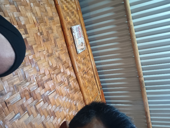 An interior scene captured in Keudebayu, Indonesia, features a woven bamboo wall or partition on the left, displaying a light brown diagonal basketweave pattern. Adhered to this wall, slightly right of center, is a small, rectangular item, possibly a framed picture or sign, with partially visible text and an illustration. A vertical light brown bamboo pole separates the woven bamboo wall from a light gray corrugated metal surface on the right, which exhibits horizontal ridges and shadows. Another segment of a bamboo pole is visible further right, parallel to the first. In the top-left quadrant, a portion of an arm or leg, clad in black fabric with an exposed patch of skin, is visible. The top of a human head, featuring dark, short, wavy hair, occupies the bottom-right corner of the frame. No specific actions or interactions are discernible.