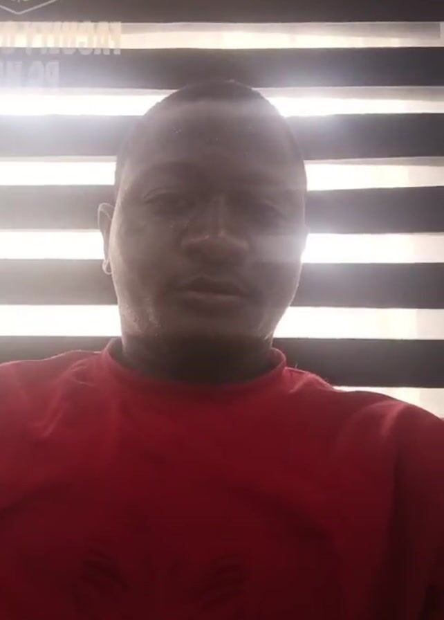 two dark-skinned men in an indoor setting. The first man is wearing a red shirt and is the primary focus in the initial shot. He is looking directly at the camera. The second man is wearing a striped shirt with red, white, and blue bands, along with a gray section featuring a large "LV" logo. He is visible in subsequent shots, looking to his side. The background includes a wall and a partially visible window with horizontal blinds that are letting light in. The camera angle changes, shifting from a straight-on view to a low-angle shot looking upwards at the second man. There is no significant action or interaction captured in the video.