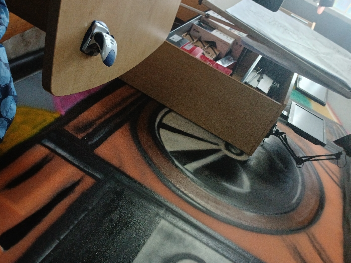The scene depicts an indoor environment, likely a creative workspace, located in the City of Unknown, Unknown. The image is captured from a low, upward-angled perspective, tilting right. A prominent wall in the background is covered with multi-colored graffiti featuring large, abstract designs in orange, black, grey, pink, and yellow, including a circular, fan-like motif. In the mid-ground, a tall, light brown, multi-shelf unit is positioned. Two dark, flat-screen computer monitors are situated on top of this unit, flanked by a black, articulated desk lamp with a conical shade. The shelves below the monitors contain various items, including what appear to be books or files, some with red spines, and a white canvas or large sheet of paper leaning on an upper shelf. In the left foreground, a light brown wooden desk with a rounded edge is visible, upon which a silver and blue computer mouse rests. A portion of blue patterned fabric, consistent with upholstery, is visible in the bottom-left corner. No individuals are present.