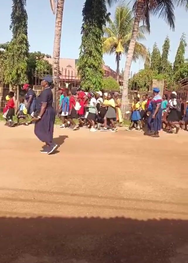 parade of school children and teachers walking on a dirt road. The children are dressed in a variety of colors and uniforms. Teachers dressed in dark blue dresses are also present, walking alongside the children. The parade is lively, and music can be heard in the background. The environment includes palm trees and fences, indicating an outdoor setting, possibly near a school or residential area. The sky is clear and bright, suggesting a sunny day. The camera angle is slightly low, possibly from a ground-level perspective.