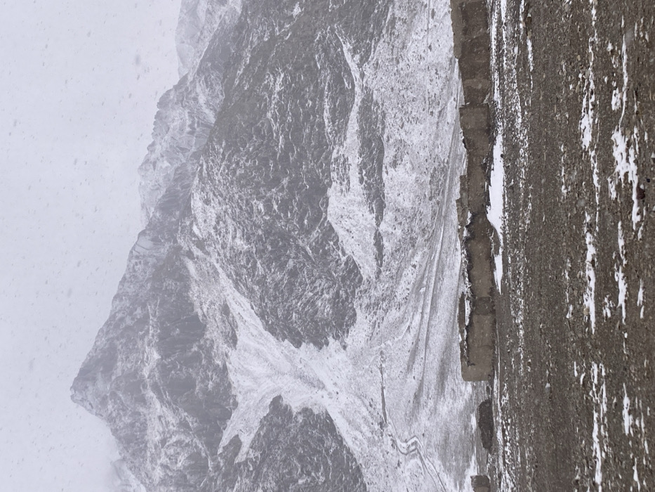 The scene is an exterior landscape located in Bostan, Pakistan, captured during active snowfall