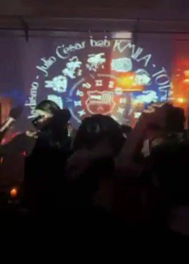 dark room with a crowd of people in front of a wall with a projection. The projection is a circular design with zodiac symbols and text, including names like "Julio Cesar". People are standing, some appearing to dance or move to music that is audible in the background. The room is lit dimly, and there are some decorative elements visible on the sides of the projected image.