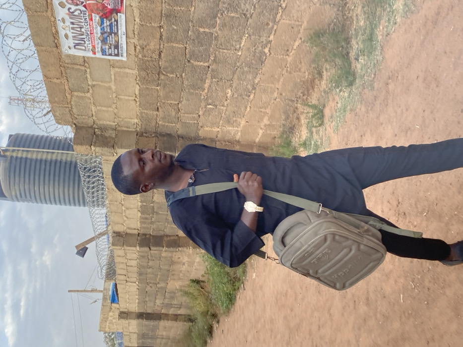 A man stands at an angle wearing a black long-sleeved shirt, black pants, and black shoes. A green bag hangs from his shoulder. He is also wearing a watch. Behind him is a brick wall topped with barbed wire. A large water tank is also visible. A poster is affixed to the brick wall. The ground is reddish-brown dirt. The sky is cloudy.