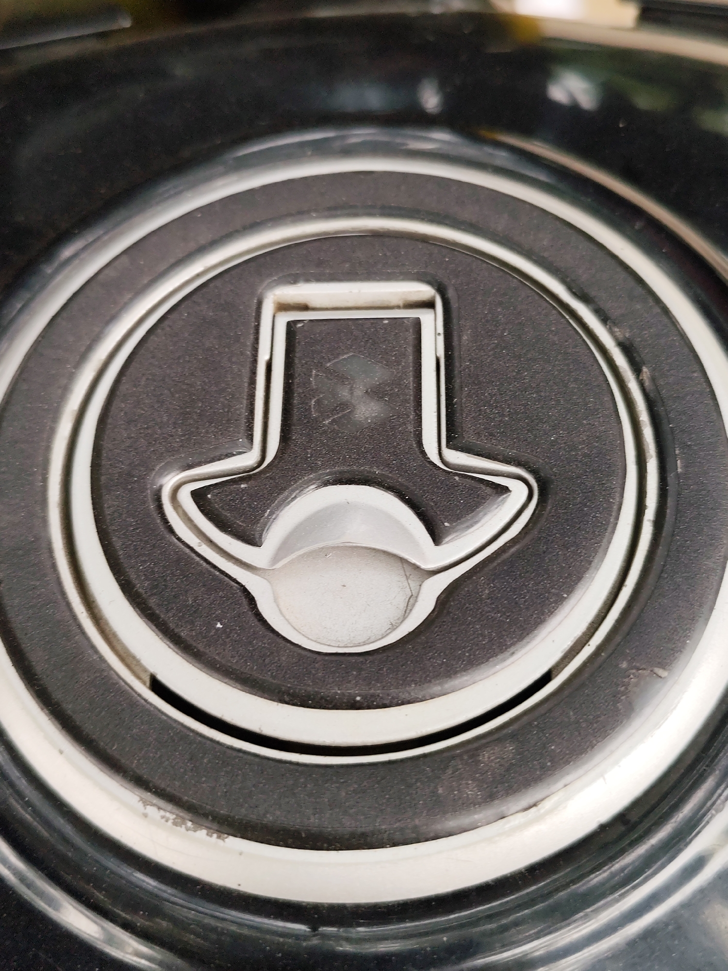 A close-up shot depicts a gas tank cap, likely from a motorcycle. The cap is circular, with a dark grey matte central section surrounded by concentric silver rings. A white plastic latch mechanism is positioned in the center, featuring a T-shaped bar and a curved segment below. The surface shows signs of wear, with minor scratches and dirt accumulation. The location cannot be identified as Dhaka, Bangladesh, based on the visual information provided.
