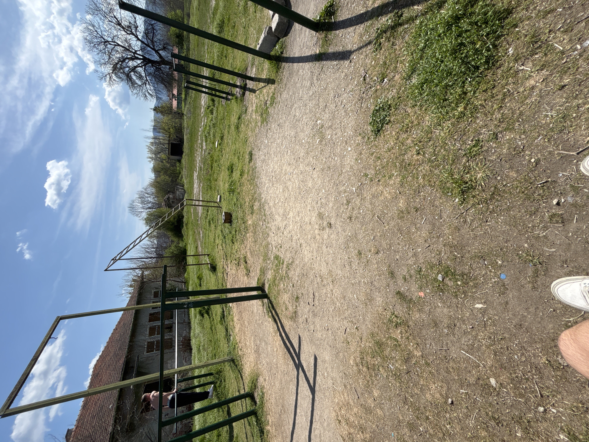 The image depicts an outdoor exercise area in what appears to be a rural or semi-rural location. A narrow dirt path runs through the center of the frame, flanked by patches of grass and vegetation. Green metal structures, resembling exercise bars and frames, are positioned along the path, casting shadows. In the foreground, a person is using one of the exercise bars. In the background, there are dilapidated buildings with boarded windows and overgrown vegetation. The sky is blue with scattered white clouds. Based on the location information provided, the scene is likely in or near Dabene, Bulgaria.