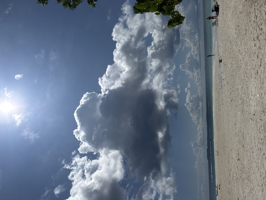 Ukulhas, Maldives. The image depicts a white sand beach under a sky featuring a bright sun in the upper left quadrant, creating a lens flare, and extensive cumulus cloud formations across a largely blue expanse. The foreground comprises a white sand beach. A narrow, dark water channel flows across the sand from the lower-center towards the ocean. A dark, weathered piece of driftwood lies on the sand to the left of this channel. Multiple indistinct, light-colored, possibly metallic, frame-like objects are present on the sand further left. In the midground, the ocean displays light turquoise shallow waters transitioning to a deeper blue. One individual, wearing an orange upper garment, stands in the shallow water near the mouth of the sand channel. Two other individuals stand on the dry sand to the right, adjacent to two dark beach loungers. In the far left background, a person on a personal watercraft moves across the water, generating a wake. Distant landmasses are visible on the horizon. Green foliage from a tree or bush partially extends into the upper right corner of the frame.