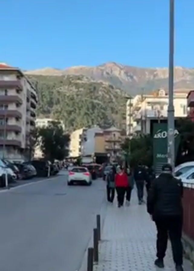 The camera shows a street in an urban area on a clear day. A mountain is visible in the distance above buildings. The street has cars parked along its left side and cars are driving down the street. People are walking on the sidewalk on the right side of the street. A sign for "AROMA Market" is visible. A tall utility pole stands next to the sidewalk. The sky is bright blue.