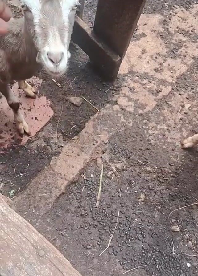 A brown goat with a white face stands on a dirt and gravel surface in an enclosure of some kind. A person's hand reaches into the frame and gently touches the goat's head. The goat looks up at the camera. The dirt ground is wet and has some small bits of debris scattered across it. There is a wooden plank along one side of the scene, and a wooden and metal structure behind the goat.