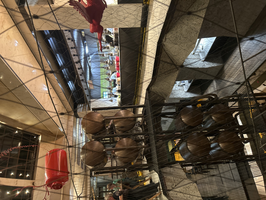 The image depicts an indoor, multi-level establishment in the Capital City of Prague, Czechia, observed from an elevated position. A dark, wide-mesh safety net or decorative screen dominates the immediate foreground, casting diamond-shaped shadows. In the mid-ground, a multi-tiered industrial-style structure is visible, featuring numerous large, spherical, copper-toned metal vessels mounted on dark metal frameworks. These elements ascend vertically through at least two levels. To the far left, behind this structure, several individuals are partially visible, seated at tables, suggesting a dining area. Two women are discernible, one with blonde hair, the other with darker hair, appearing to be conversing or dining. Above, suspended from the ceiling, are two prominent red decorative objects: on the left, an abstract coiled form resembling a stylized animal head or mechanical part, and on the right, a large, winged bird sculpture, possibly a flamingo. In the background, beyond the structural elements, an brightly illuminated open kitchen area extends horizontally. Multiple kitchen staff, wearing light blue uniforms, are actively engaged in food preparation behind a long counter. The counter is lined with various containers, kitchen equipment, and several silver heat lamps suspended from above. Below the primary visible floor, additional copper-toned vessels on metal frames are observed. Further down, through openings in the concrete-like structure, a lower-level area with counters and dimly lit sections is visible, suggesting further functional or dining spaces. The overall lighting is a mix of warm ambient light and brighter task lighting in the kitchen area.