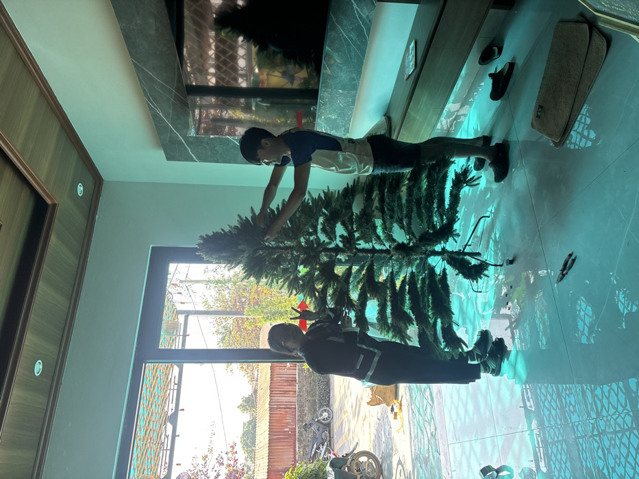 Two people assemble a Christmas tree near a large window. One individual, wearing a blue and white shirt with dark shorts, is adjusting the top branches. The other person, dressed in a dark outfit with white accents, gestures with a peace sign towards the camera. Outside the window, a partially visible bicycle rests in a yard. The room features a patterned floor, a television mounted on a wall, and decorative elements like shoes and a mat near the wall.
