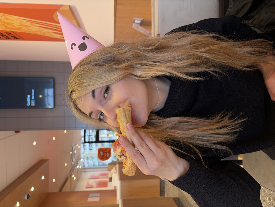 A female individual is depicted in the foreground, seated inside Galactic Pizza at Adžića 2, Podgorica, Montenegro. She possesses long, wavy blonde hair and wears a black high-neck, long-sleeved top. A thin white choker is visible around her neck. She wears a pink conical party hat adorned with a black cartoon bear face. Her right hand holds a slice of pizza with a thick, flaky crust, which is positioned against her mouth. The pizza toppings include visible red onions and other indeterminate ingredients. She is looking directly at the camera with a slight smile. The background shows a modern restaurant interior featuring light wood paneling on the walls and ceiling, along with recessed lighting fixtures. A digital display screen mounted on a tiled wall reads "Cooking" and "Na čekanju" (On hold). To the right, a large orange graphic or poster with Cyrillic text is partially visible. Through a glass entrance door in the distant background, the "GALACTIC" sign is discernible, along with a subtle Halloween-themed decoration.
