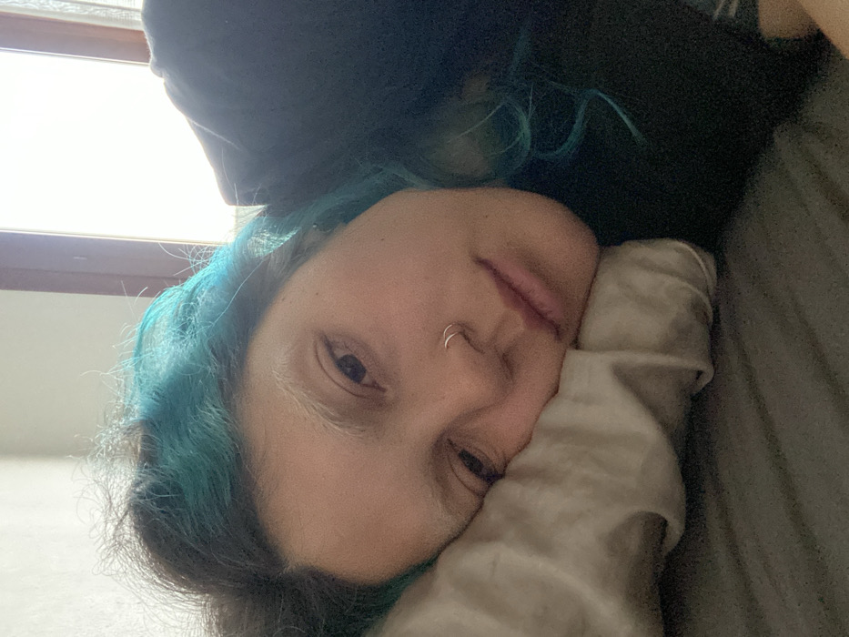 A close-up, horizontal image captures an individual, likely female, lying on their left side in a bed within an indoor setting, presumed to be in Gijón/xixón, Spain. The individual rests their head on a light grey pillow, with a dark grey sheet or blanket covering their body from the shoulders down. Their head is positioned towards the center-left of the frame, with their gaze directed towards the camera. The person exhibits dark hair with distinct turquoise-colored streaks or sections, particularly visible on the top and side of the head. Their eyebrows are notably light, appearing bleached or blonde. A double hoop, silver-toned nose ring is present on the right nostril. The eyes are partially open, and the mouth is slightly agape. The individual is wearing a dark-colored garment, possibly a black t-shirt, visible around the neck and shoulder area. In the background, to the upper right, a bright, overexposed window with a dark brown frame is visible, indicating ambient daylight. To the upper left, a plain, light-colored wall is present. The overall scene suggests a moment of rest or waking.