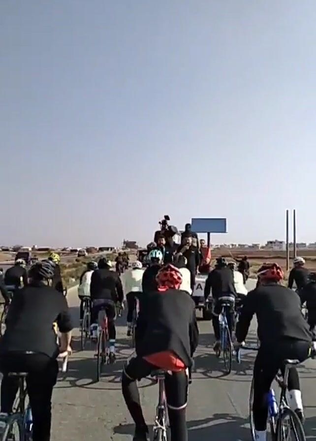 A group of cyclists rides down a road towards a small crowd standing next to a truck. Most of the cyclists wear black jackets and dark pants, with helmets of various colors. The truck appears to be carrying people with cameras, and there's a blue sign visible. The road is surrounded by a dry, dusty landscape with a few buildings in the distance. The sky is clear and blue. A couple of cyclists briefly embrace. The camera is positioned behind the cyclists, capturing their movement towards the crowd.
