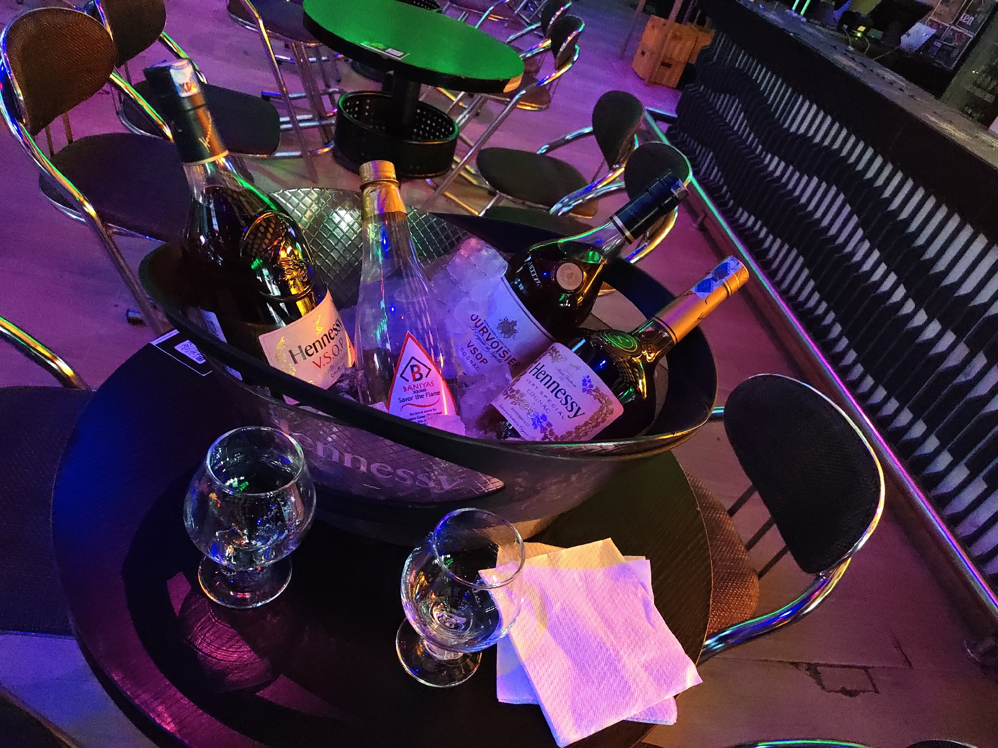 The scene depicts the interior of a dimly lit bar or lounge, presumably located in Eldoret, Kenya. In the foreground, a dark circular table with a textured surface holds a branded Hennessy ice bucket filled with ice and an assortment of alcoholic beverages. The visible bottles include one large bottle of Hennessy V.S.O.P cognac, one smaller bottle of Hennessy Very Special Cognac, one bottle of Courvoisier VSOP Cognac, and one clear, unlabeled glass bottle. A small triangular label for "Baniyas Square" is also present on one of the bottles. Two empty snifter-style glasses and two folded white paper napkins rest on the table beside the ice bucket. The environment is characterized by prominent blue, purple, and green ambient lighting, which reflects off the chrome frames of multiple modern chairs with dark upholstered seats and backrests, positioned around various tables. In the background, additional tables are visible, including one with a distinct green circular top. A dark, patterned wall or bar structure with a glowing colored light strip at its base is present on the right side of the image. No individuals are visible within the frame.
