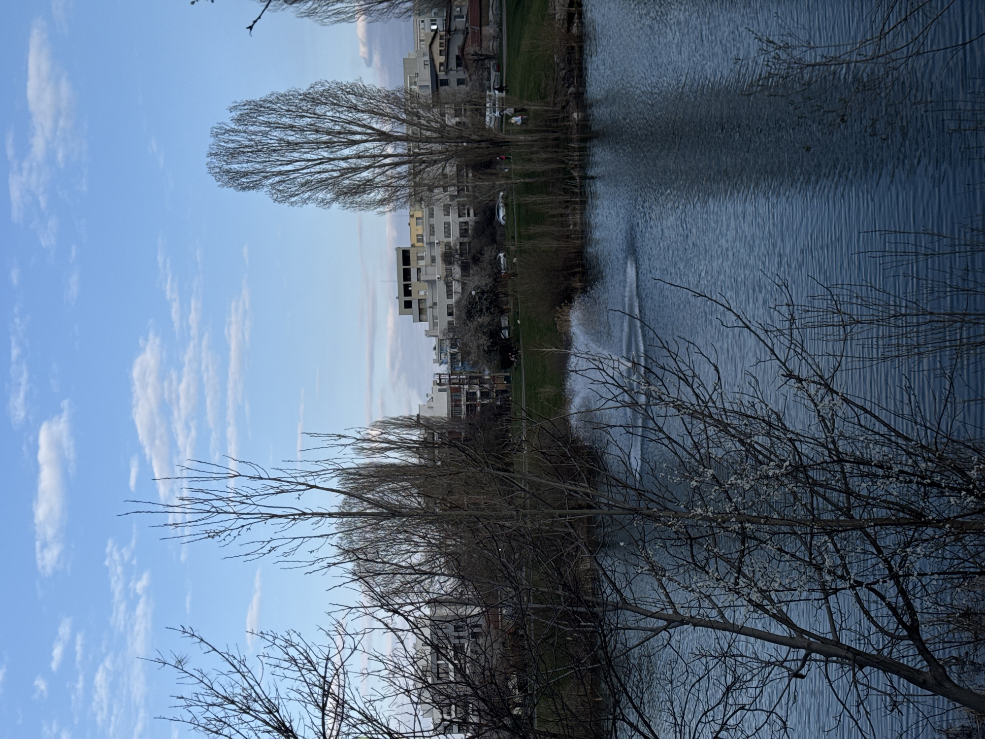 The image presents a scene from South Park in Sofia, Bulgaria, focusing on a lake area with urban buildings in the background. The sky is light blue with scattered white stratocumulus clouds. In the immediate foreground, blurred bare branches of deciduous trees, some exhibiting early budding, frame the lower and left edges of the frame. A dark blue body of water, identified as a lake or large pond, occupies the lower-middle section of the image, showing ripples on its surface. A fountain is actively spraying water near the left edge of the lake. Beyond the water, a grassy bank slopes upwards, featuring numerous bare deciduous trees, including several tall, slender poplars. On this bank, indistinct figures of approximately four individuals are visible, engaged in walking or standing. In the distant background, a collection of multi-story residential and commercial buildings, primarily light grey and white, are visible, consistent with urban architecture in Sofia. Several vehicles are discernible on a road behind the park's bank. The lighting suggests late afternoon or early evening.