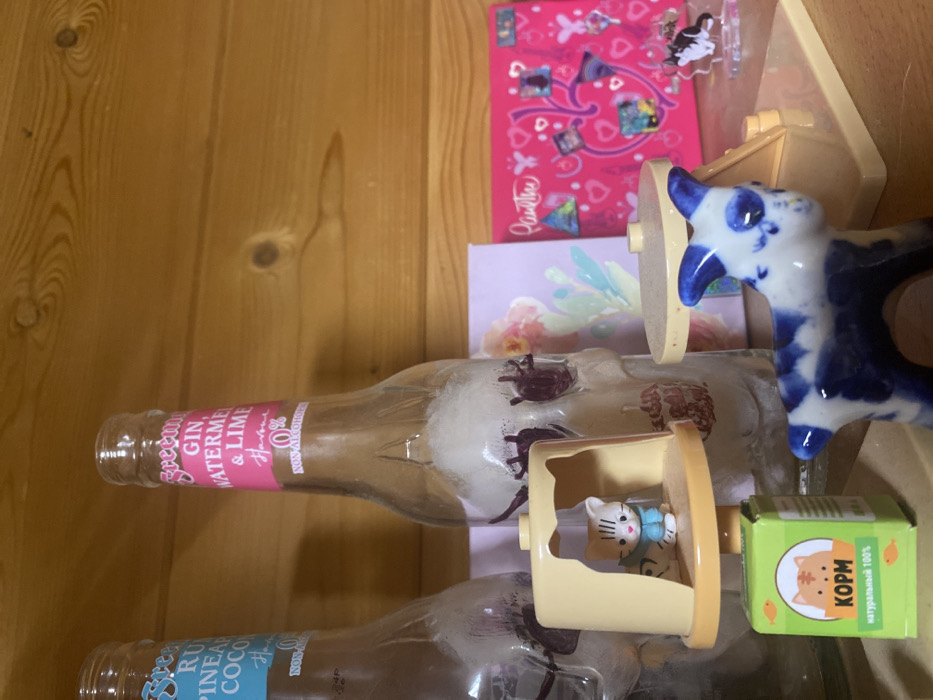 The image displays two empty bottles lying horizontally. The top bottle is "Freemans GIN WATERMELON & LIME", while the bottom one is "Freemans PINEAPPLE COCONUT". Both are labeled as 0% non-alcoholic. On top of the bottles are several toy items, including a small blue and white cow figure, a yellow toy cat house with a tiny cat inside, and a small green box labeled "KORM" (a cat food brand). A pink notebook and a greeting card are placed in the background. The surface appears to be wooden.