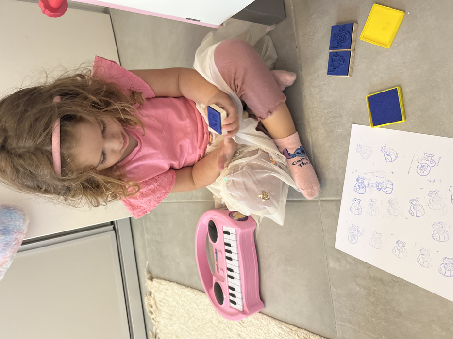 A young female child with light brown, curly hair and a pink headband is seated cross-legged on a light grey tiled floor within a domestic residence in Ramat Gan, Israel. She is wearing a pink short-sleeved top with eyelet details, a light-colored sheer skirt with glitter embellishments, pink leggings, and light pink ankle socks featuring a blue cartoon character. The child is focused downwards, holding a rectangular wooden stamp with a blue rubber design. To her left, a white sheet of paper is laid on the floor, covered with multiple blue stamped cartoon character impressions. Adjacent to the paper are a blue ink pad in a yellow plastic case and an empty yellow plastic case. Two additional wooden stamps with blue character designs are also on the floor. A pink toy keyboard is positioned to the child's left, partially resting on a cream-colored rug. In the background, a white door frame or closet door is visible, along with a portion of a white easel with a pink accent. A soft, multi-colored fluffy object is partially visible in the upper left background.