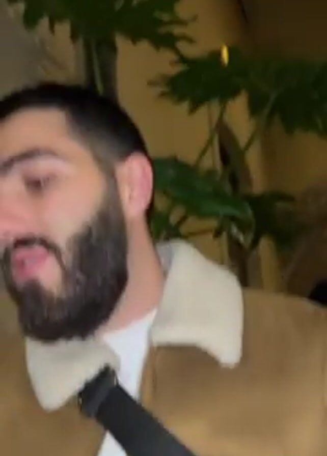 The video begins with a shot of feet on a floor, then cuts to a man with a beard and a brown jacket, who appears to be talking