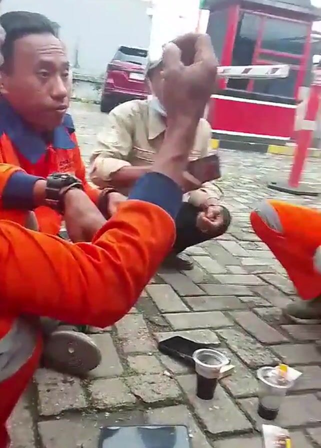 Several men, some wearing orange jumpsuits, are sitting on a brick-paved area outside. There are disposable cups of coffee, cigarettes, and phones on the ground. The men are interacting and using their phones. There is a building and a car in the background.